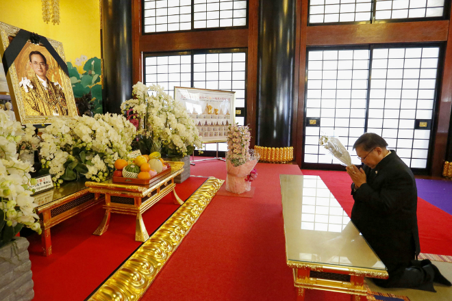 釈迦堂にて 故プミポン国王陛下の奉納仏像と御影を前に一心に祈りを捧げる 外務副大臣閣下