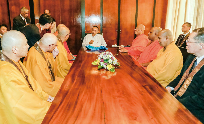 12 月10 日、訪問団は、スリランカ国会議事堂にて、首相閣下、国会議長閣下、国会副議長閣下、仏教大臣閣下と相次いで会見されました。首相執務室にて首相閣下と、議長貴賓室にて、国会議長閣下との御会見が行われ、仏教興隆への思いが語り合われると共に、今後の協力体制が確認されました。