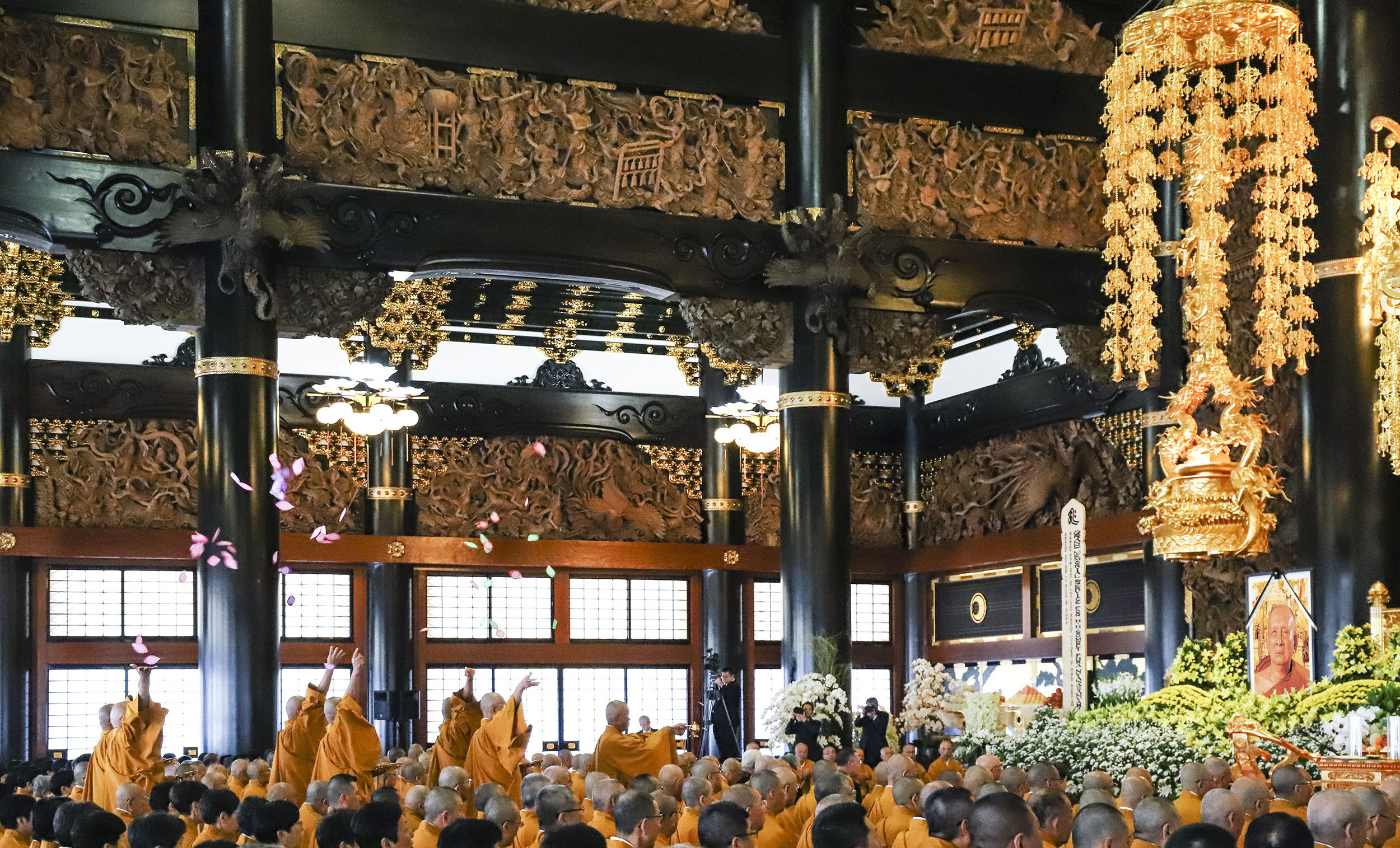 開式 導師入堂と共に散華が堂内を荘厳する