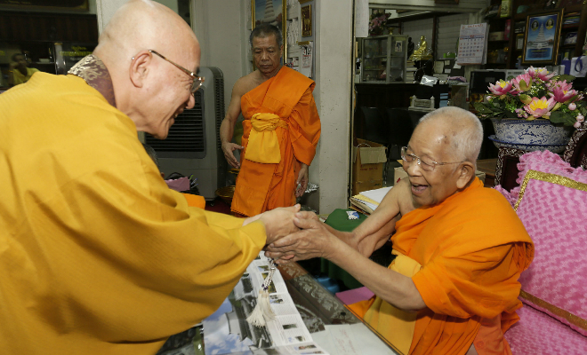 パクナム寺院にて、タイ法王代行ソムデット・プラ・マハ・ラジャマンガラジャン猊下との御会見が和やかに執り行われました。猊下は、共に手を携えて、全世界への仏教興隆に邁進することを誓われ、今後とも佛教サミットを全面的に支援・協力していくことを互いに約束し、満面の笑みと共に、固い握手が交わされました。