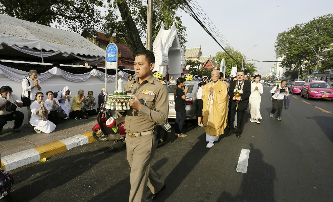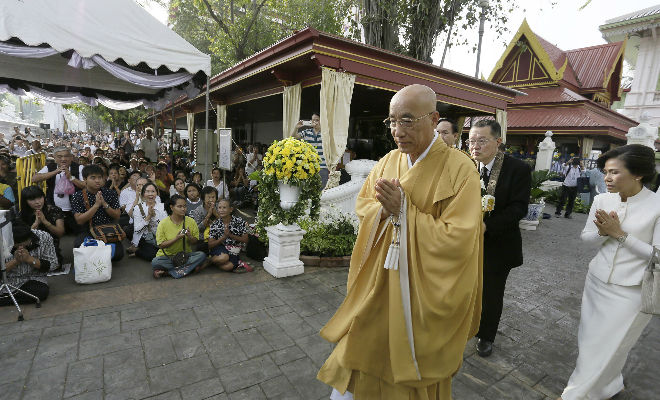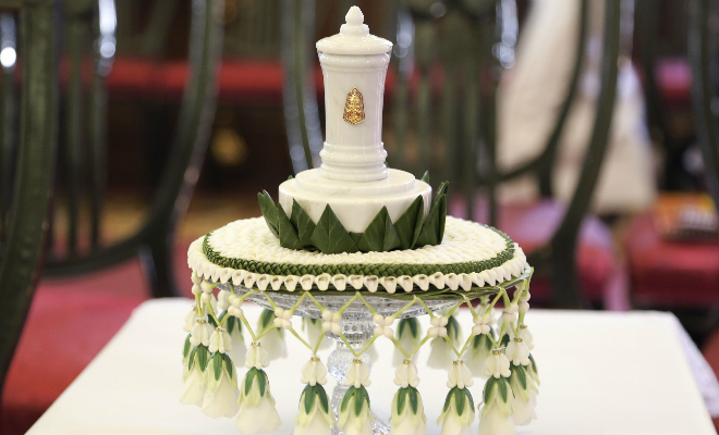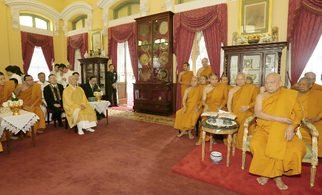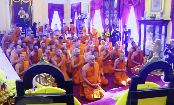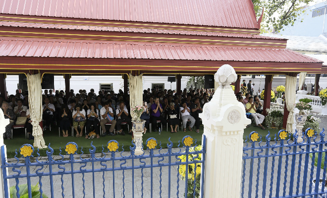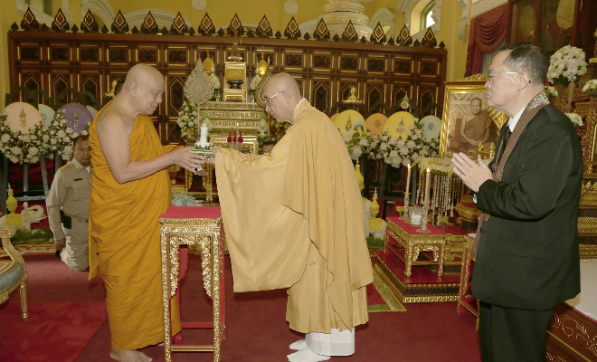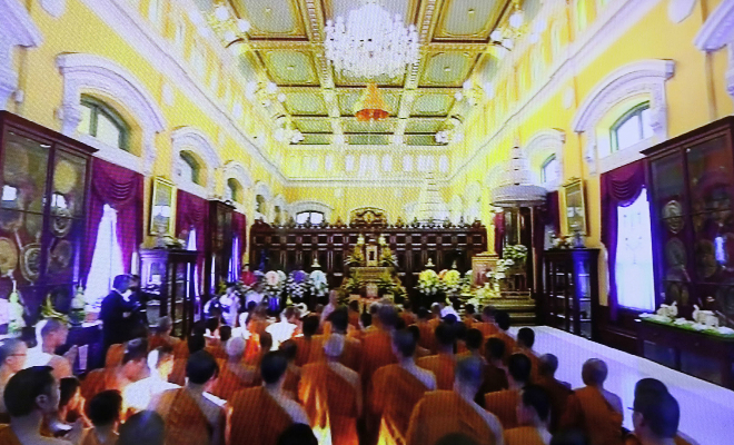 タイ王国国王陛下御名代 ワチラロンコーン皇太子殿下が故法王猊下御聖骨の骨上を行われました。骨上式典には、シリントーン王女殿下を始めとするタイ王室が臨席され、式典後、御聖骨は故法王猊下の自坊 ボヴォラニヴェス寺院に奉安されました。
