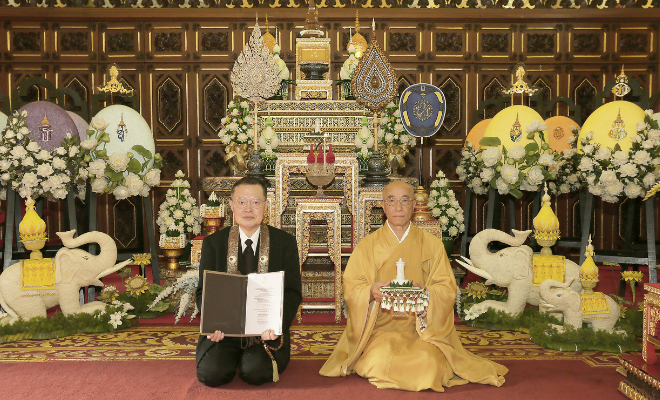 タイ王国大使館・外務省を通じて、タイ佛教僧伽大長老会、並びに、国葬政府実行委員会の御承認、タイ王国宮内庁の御承認、そして、タイ国王陛下の御承認を経て、故ソムデット・プラ・ニャナサンバラ法王猊下の御聖骨を拝受する運びとなりました。平成27 年12 月24 日、タイ法王猊下の自坊、ボヴォラニヴェス寺院にて、管長猊下より直々に御聖骨が分骨されました。