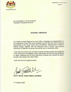 佛教之王堂 落慶法要 及び 第五回佛教サミットに寄せられた 314通の祝辞