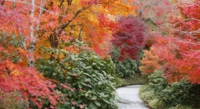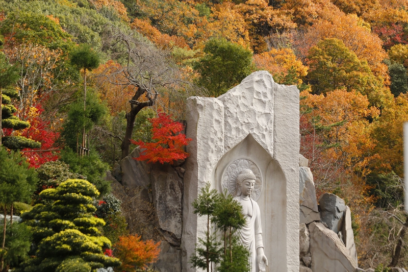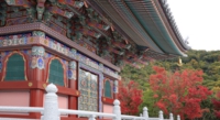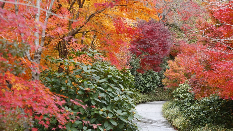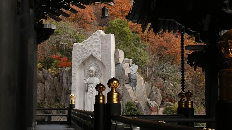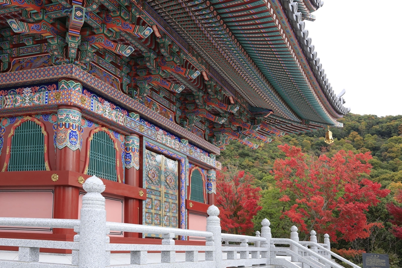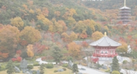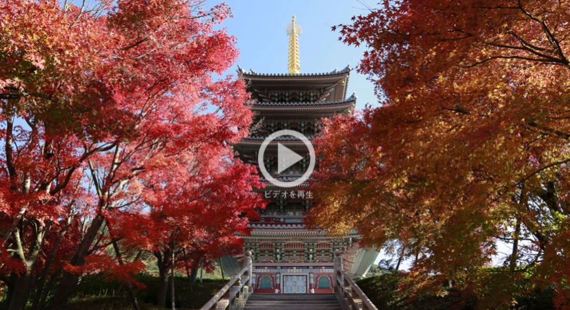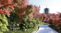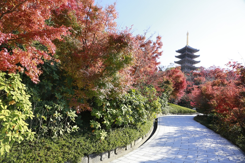 五重塔が鮮やかな紅葉に彩られ 境内の秋色は日に日に深まります