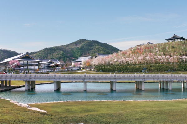 途中に一切繋ぎ目のない総延長141mに及ぶ一直線の橋は、煩悩に満ちた此岸から、悟りの彼岸へ真っ直ぐに渡る心、「直心」を表しています。この橋を渡る間に心の垢を洗い流し、浄らかな心で参詣する心構えを作っていくのです。
