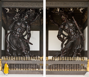 山門の巨大な扉を開放する際に用いる四基の扉止めは、中国人間国宝により制作された四体の邪鬼である。煩悩を表す邪鬼が変じて、浄土へ至る山門の扉を開ける役目を担っています。