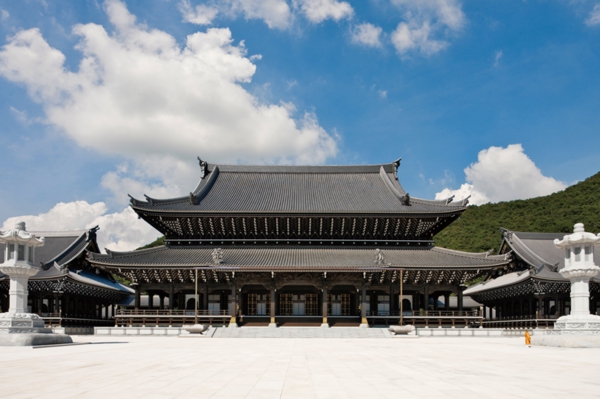 上層部は六手先総詰組様式、下層部は四手先総詰組様式、18階建ビルに相当する高さ51.5m、屋根上に、124,000枚の瓦を敷き、上層部に扇垂木を用いた日本建築史上初の仏教建築です。頂上に聳えるギネス世界記録認定の鬼瓦は、憤怒の形相が、衆生の心中に潜む煩悩を払い、清浄無垢な心を顕現させます。