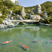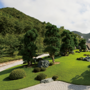 念佛宗発祥の地にして、「北嶺」京都を象徴する千余本の北山杉。日本全国から集まった百本をこえる槙の銘木、銘石を配しています。春には、大島桜、彼岸桜、八重桜、牡丹桜など七千本の品種物桜が一面を染め、霧島ツツジ、久留米ツツジ、平戸ツツジなど二十万本のツツジが色鮮やかに花開きます。梅園、牡丹園、藤棚、菖蒲、紫陽花、百日紅(さるすべり)、蓮等が四季折々に咲き乱れ、秋には、イロハ紅葉、ノムラ紅葉など三千本の紅葉と満天星(どうだん)ツツジによって茜色に彩られます。日本庭園が和の心を伝え育みます。