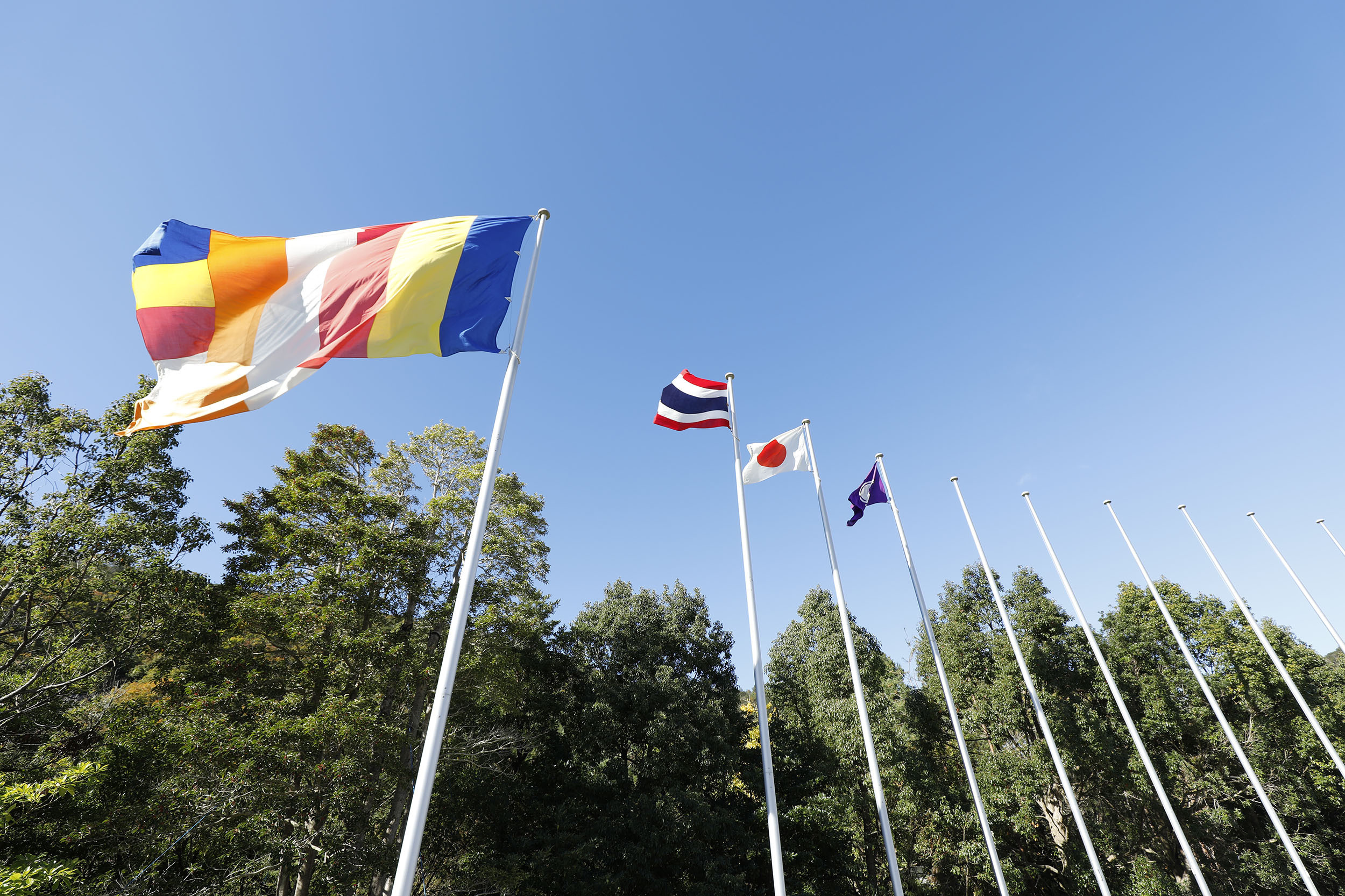 青空にはためく仏旗 タイ王国旗 日本国旗 念佛宗旗