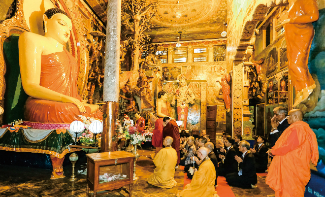 平成8 年、コロンボのバンダラナイケ記念国際会議場にて、念佛宗御開祖・佛教サミット最高顧問の説かれた大説法「大乗仏教の真髄」の開催、そして、平成10 年には、全宗派(三宗四派)の管長猊下の連名により、最高顧問に対し、最高栄誉称号が授与されて以来、スリランカ仏教 三宗四派と念佛宗は固い絆で結ばれています。