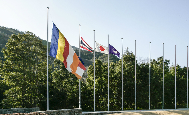 タイ国王陛下の ご崩御を悼み 半旗にて掲げられた 仏旗 タイ国旗 日本国旗 念佛宗旗