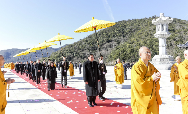 国王陛下百箇日法要は、郡真海長老を導師とするお練りにより、始まりました。お練りには、タイ王国 副首相閣下、文化副大臣閣下、駐日タイ王国特命全権大使閣下を始めとする、タイ王国側50 名にも及ぶ参列者が、念佛宗と並んで列をなし、お練りを荘厳する天蓋、それに連なる、黄衣の僧侶、そして2500 名を超える参列者が続き、参道は本堂から総門まで、切れ目無く一直線に連なる、かつてないほどの壮大なお練りとなりました。
