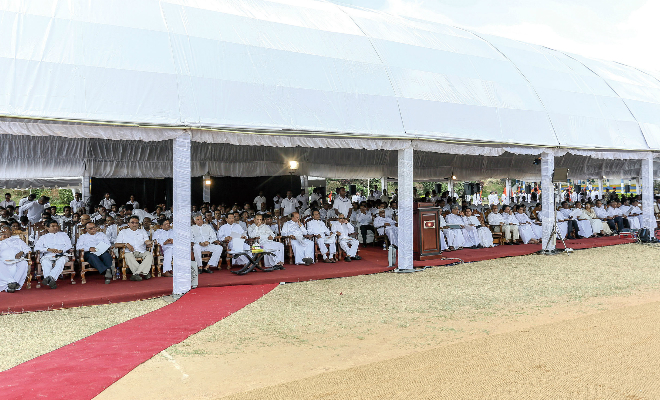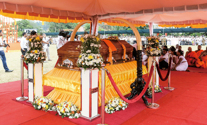 国葬は、市内に特別な交通規制が敷かれ、陸・海・空 の三軍による厳重な警護の中、スリランカ陸軍 による弔砲で始まりました。大統領閣下・首相閣下・各省庁の大臣閣下・三軍の長を始め、国会議員・ 外交官・政府高官が多数参列されました。