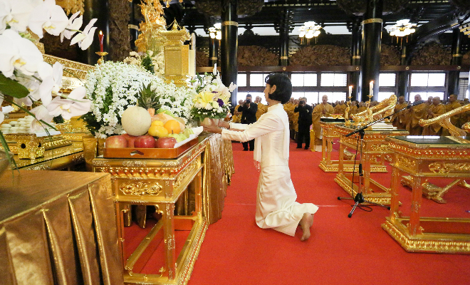 本堂 宮殿 故シアヌーク陛下の御聖骨を祀り 追悼大法要が厳かに開式される