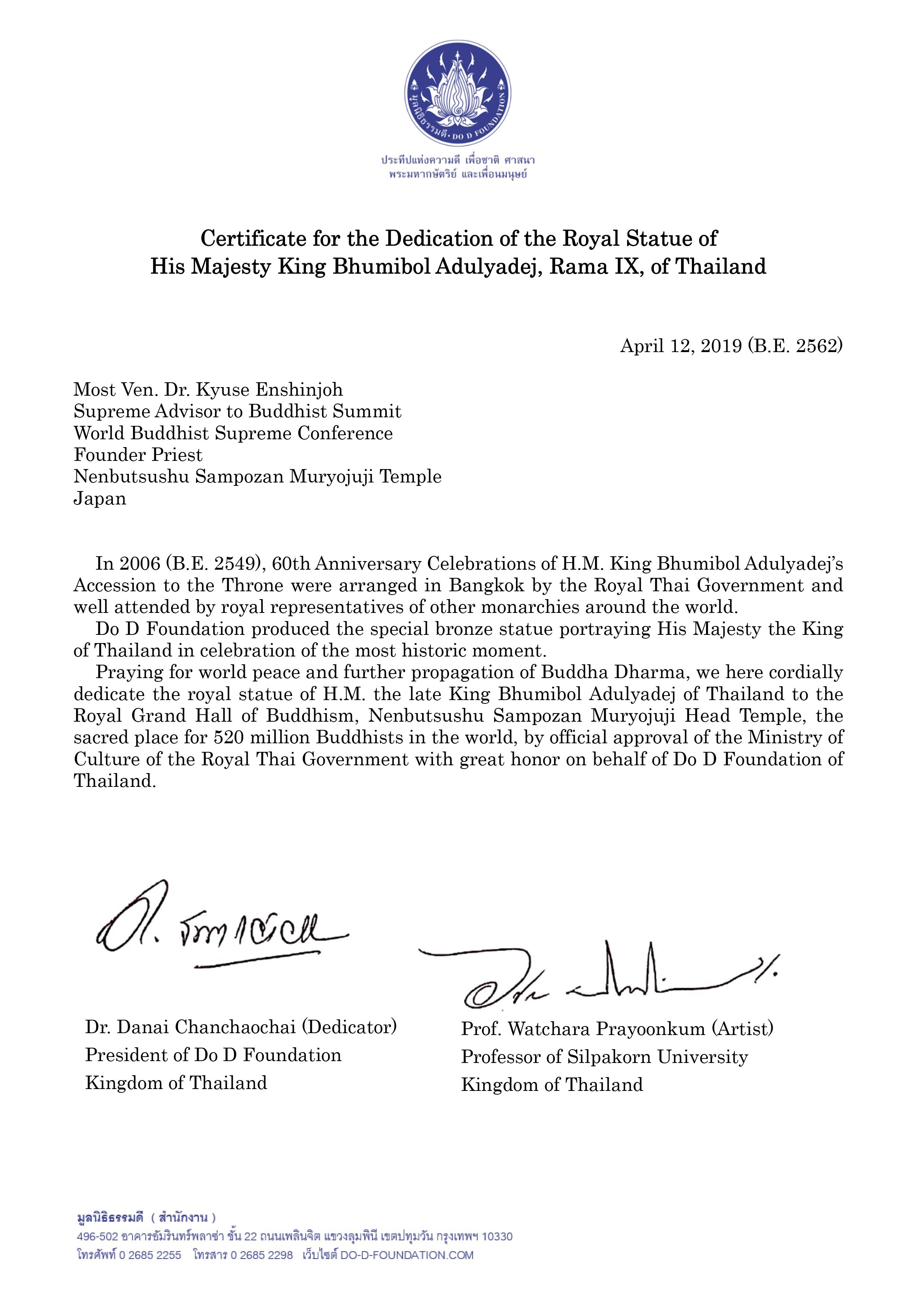 奉納者のタイ王国 タムディ財団会長と 制作者のタイ王国シラパコーン芸術大学 ワッチャラ・プラユーンカン教授の署名入りの 彫像奉納証明書