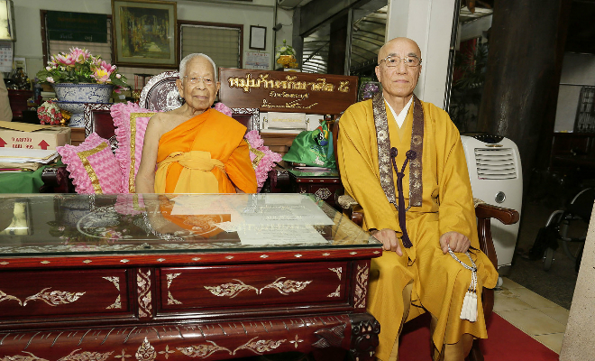 パクナム寺院にて、タイ法王代行ソムデット・プラ・マハ・ラジャマンガラジャン猊下との御会見が和やかに執り行われました。猊下は、共に手を携えて、全世界への仏教興隆に邁進することを誓われ、今後とも佛教サミットを全面的に支援・協力していくことを互いに約束し、満面の笑みと共に、固い握手が交わされました。