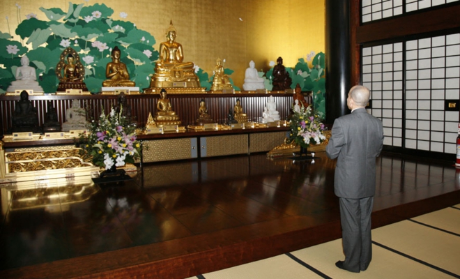 奉納された仏像を参拝される(中央上段はタイ王国 国王陛下御奉納の仏像)
