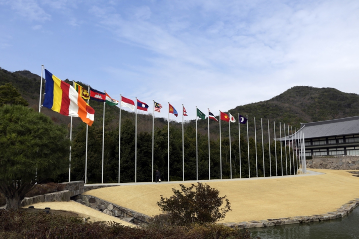 駐日特命全権大使閣下が参列された11ヶ国の国旗が 春風に たなびく