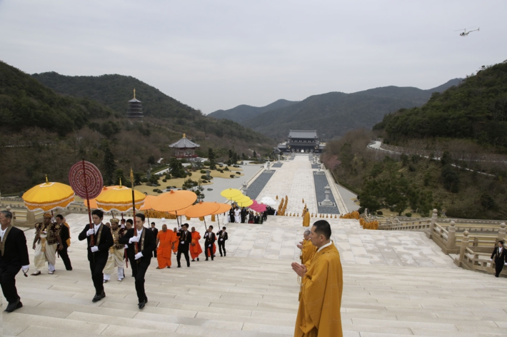天蓋に守られ 釈尊真身舎利を携えた仏舎利守護官(ニラメ)が参道階段を登る