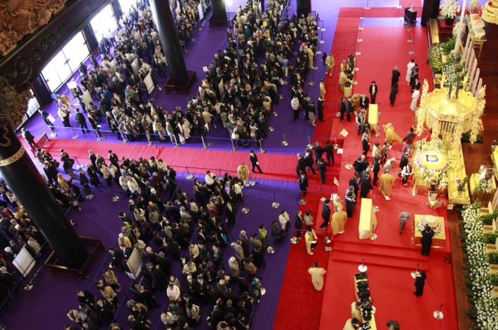 釈尊真身御舎利の礼拝を待つ長蛇の列 本堂は多くの人々であふれた