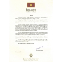 我が国スリランカが平和と和解と発展という新たな時代を迎えたこの時期に、日本国の「佛教之王堂」、念佛宗九州本山、並びに、念佛宗福井別院において、2,300年以上前にスリランカに初めて仏教が伝来したミヒンタレーのラージャ・マハー・ヴィハーラ大寺に祀られてきました、聖なるお釈迦様の真身御舎利の御開帳が行われますことは、この上なく素晴らしいことであり、スリランカと日本の仏教徒に喜びをもたらし、両国の友好を大いに促進することでありましょう。