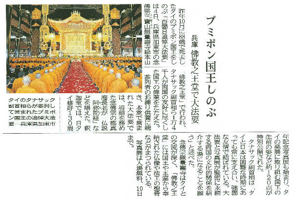 その模様は、タイ王国にて、国営テレビ並びにインターネットにより、王国全土に大々的に報道され日本においては、毎日新聞、神戸新聞、ジャパンタイムズを始め、全国各紙に報道されましたので、その一部を紹介いたします。
