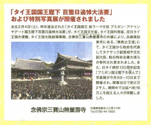 タイ王国文化省、タイ王国外務省、在京タイ王国大使館、タイ王国大阪総領事館、念佛宗三寶山無量壽寺の共催により営まれました『タイ国王陛下崩御 百箇日追悼大法要』および『日タイ修好130周年記念写真展』が厳粛かつ盛大に執り行われ、無事閉幕いたしました。