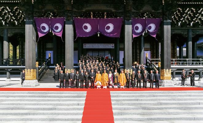 念佛宗の追悼大法要 各国国家元首の写真が並ぶ
