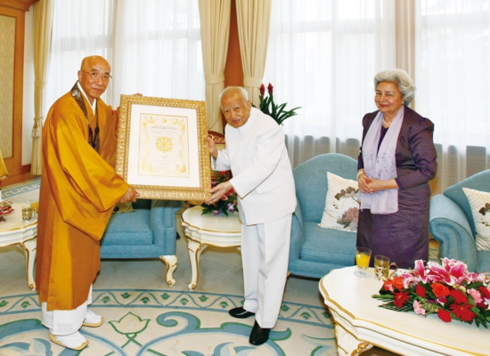再び、平成24年8月14日、念佛宗御開祖 御名代 郡真海法主が、北京の宮殿を表敬訪問され、シアヌーク陛下へ、念佛宗 名誉総裁 御就任の額入り証書をお手渡しされました。
