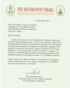 タイ法王庁より、病床に就かれているタイ法王 ソムデット・プラ・ニャナサンバラ猊下が、佛教サミット会長からの栄誉称号に対し、「大いなる栄誉の中、喜んで称号をお受け致します」と仰せになり、9 月1日、タイ王国法王庁より公式受諾書が届けられました。