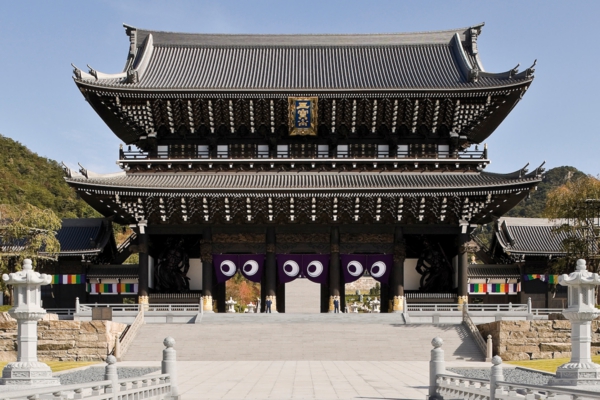 上段は日本史上初の六手先総詰組様式。下段は四手先総詰組様式。上層部に扇垂木を用い、全門が680点の彫刻で荘厳されている。正面の山号額は、世界に類例のない、高さ5.25メートル、幅3.15メートル、本畳に換算して10.2畳という、日本一の大きさを誇る山号額。中国人間国宝制作の阿吽の仁王像は、世界最大級にして総漆塗り。山門の両脇から俗界を見渡し、悪を断じ善をすすめます。