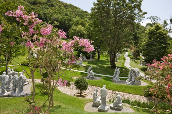 中国工芸美術大師(人間国宝)She Guo Ping仏師制作の等身大・オリジナルの五百体の石像羅漢(仏弟子)が配され、全面が緑の芝生に覆われた、「南都」(奈良)の若草山を想起させる広大な庭園です。