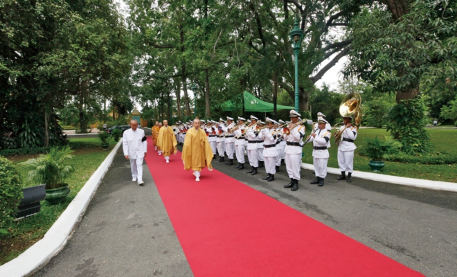 一路、カンボジア王国 プノンペンへ。副首相兼宮内庁長官閣下のお迎えを受け、王宮内へと進み、シアヌーク陛下の祭壇に合掌礼拝。弔意を伝える念佛宗一行に、シハモニ国王陛下、モニーク皇太后陛下は、感謝のお言葉を述べられました。
