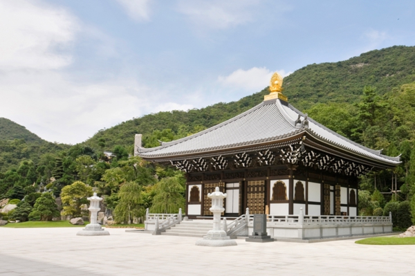 This hall enshrines the statue of Amida Triad carved by Mr. She Guo Ping, a living national treasure of China. In this hall, Buddhist ceremonies for transferring merits to ancestors and the departed are performed in order to show our gratitude to the past generations. Many sculptures, including those of the Buddhas and their manifestations as 10 kings of other worlds, adorn the transoms on the four sides of the hall.