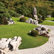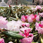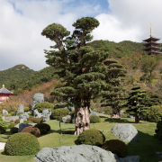 念佛宗発祥の地にして、「北嶺」京都を象徴する千余本の北山杉。日本全国から集まった百本をこえる槙の銘木、銘石を配しています。春には、大島桜、彼岸桜、八重桜、牡丹桜など七千本の品種物桜が一面を染め、霧島ツツジ、久留米ツツジ、平戸ツツジなど二十万本のツツジが色鮮やかに花開きます。梅園、牡丹園、藤棚、菖蒲、紫陽花、百日紅(さるすべり)、蓮等が四季折々に咲き乱れ、秋には、イロハ紅葉、ノムラ紅葉など三千本の紅葉と満天星(どうだん)ツツジによって茜色に彩られます。日本庭園が和の心を伝え育みます。