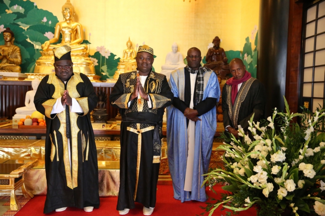 コーキ王国 アポロ・サンサ・カブムブリ二世 国王陛下(写真中央)ハッジ・イドゥ・アフメッド・キワヌカ首相閣下(左)