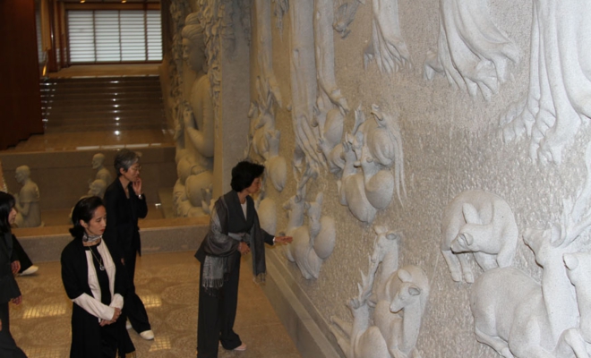 鹿野苑を彷彿させる 石彫刻を御覧になる