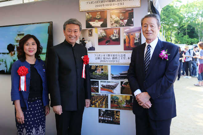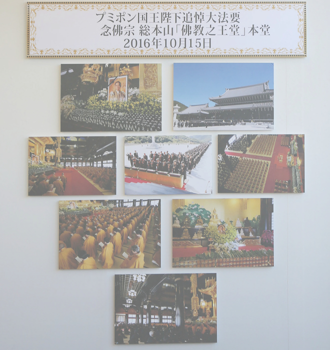 念佛宗総本山「佛教之王堂」で行われた タイ国王陛下追悼大法要写真前にて駐日タイ王国特命全権大使バンサーン・ブンナーク閣下(中央)タイ王国 総領事代行チャニダー・ガモンナウィン氏(左)と共に