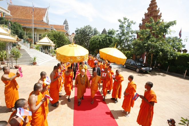 テプ・フォン法王猊下のお出迎えを受け 天蓋に護られながら本堂へと進む