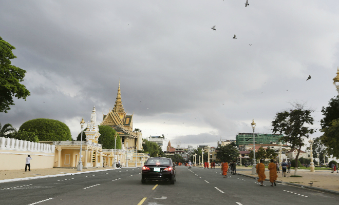 モニーク皇太后陛下のお誕生日を翌日に控えた、平成 28 年 6 月 17 日、念佛宗訪問団は、国王・皇太后両陛下との謁見のため、全ての交差点に警官が配備される、国を挙げての警備態勢の中、白バイ・パトカーの先導により、市内をノンストップで走行し、プノンペン王宮へと向かいました。