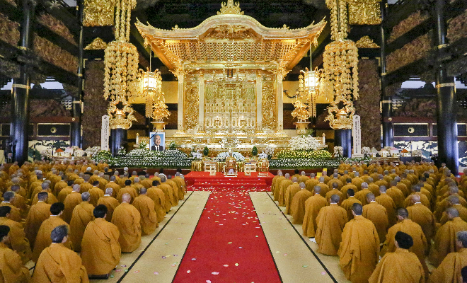 本堂 宮殿 故シアヌーク陛下の御聖骨を祀り 追悼大法要が厳かに開式される