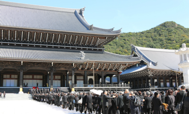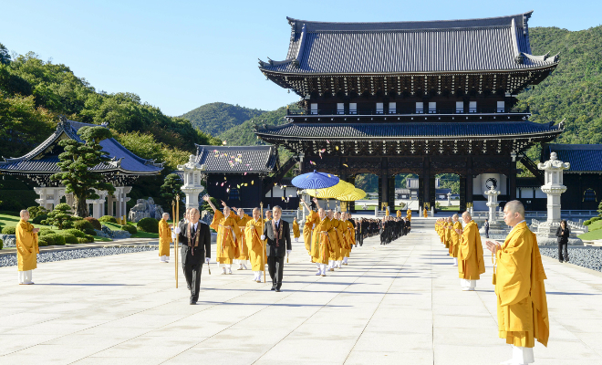 雲ひとつない 秋晴れのもと 追悼大法要のお練り供養が 山門から進む