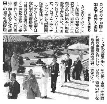 平成 28 年 10 月 17 日付 毎日新聞に、故シアヌーク陛下の御聖骨を祀る、念佛宗総本山「佛教之王堂」にて執り行われた、追悼大法要の記事が、両王女殿下の参道を進む お練り写真と共に掲載されました。