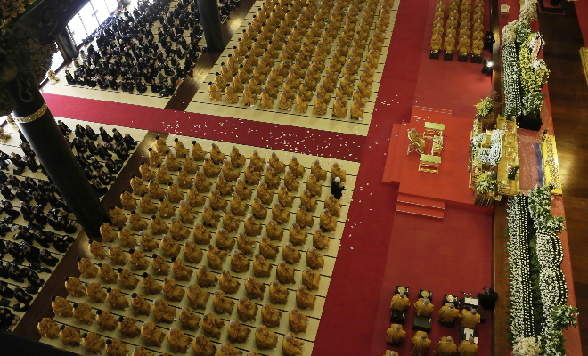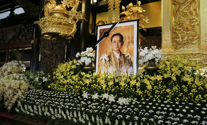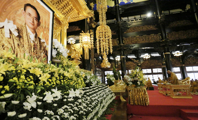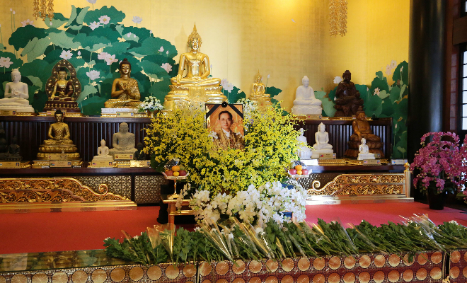 タイ王国 プーミポン国王陛下の奉納仏の前に 弔問者の献花が 手向けられる