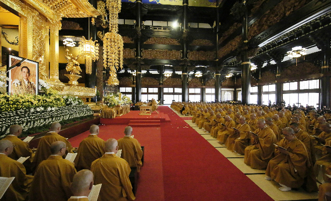 念佛宗は、訃報を受けてすぐ、タイ王国へ哀悼の意を込めた弔辞をお送りし、平成 28 年 10 月 15 日、日本全国から、念佛宗の僧侶、尼僧、檀信徒が参集し、総本山「佛教之王堂」の本堂を埋め尽くす中、国王陛下を偲ぶ追悼大法要が執り行われました。本堂宮殿の前には、陛下のシンボルカラーである「黄」の花で荘厳された祭壇が設けられ、堂内には陛下を偲ぶ念仏が響きわたりました。