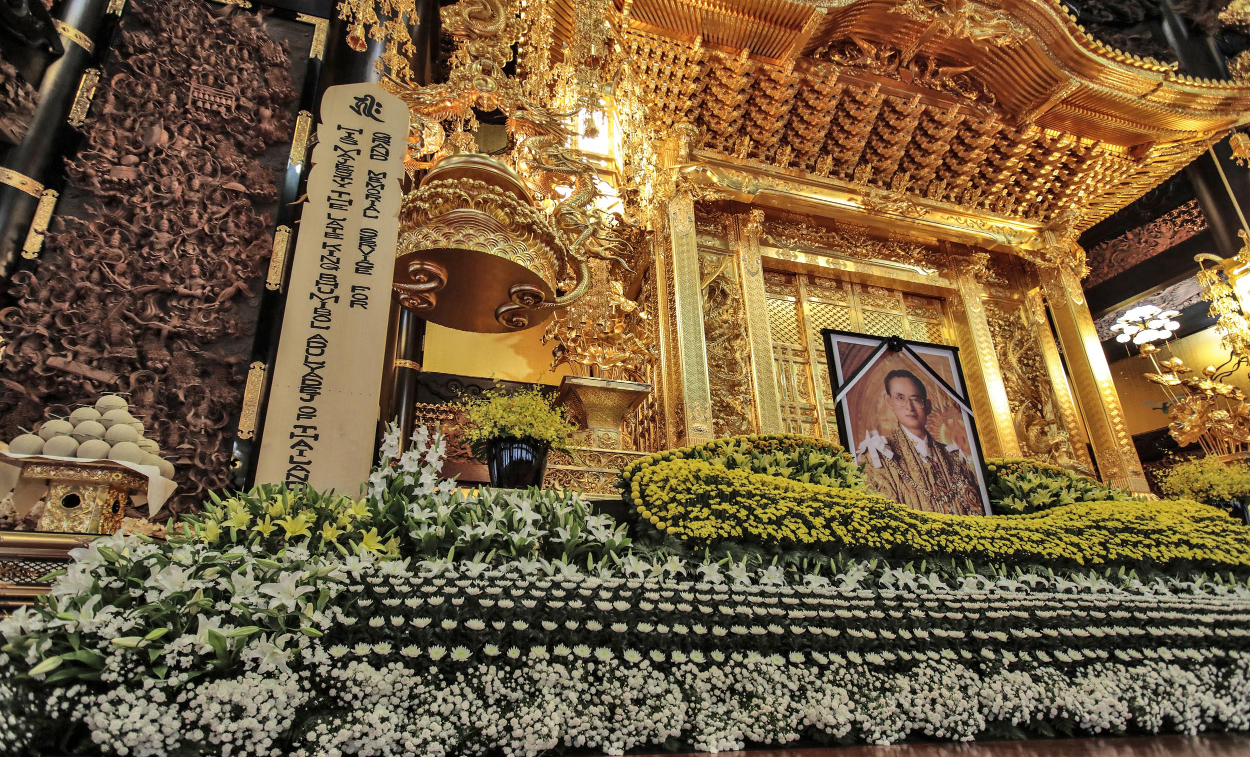 故プミポン国王陛下のシンボルカラー「黄」の花で荘厳された祭壇
