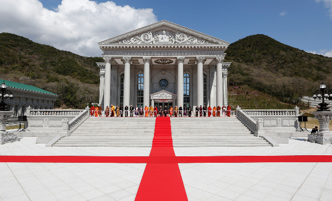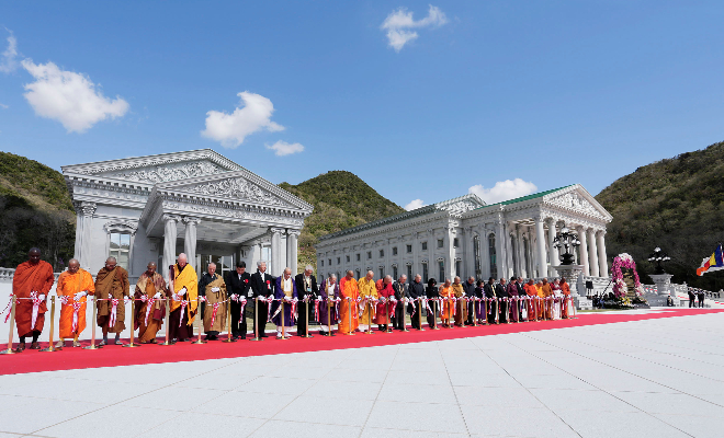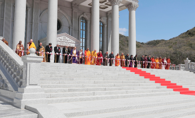 仏教興隆と世界平和を願い 世界各国より参列者が集う七葉窟大講堂・王本殿の前に参集し 共に落慶をお祝いした