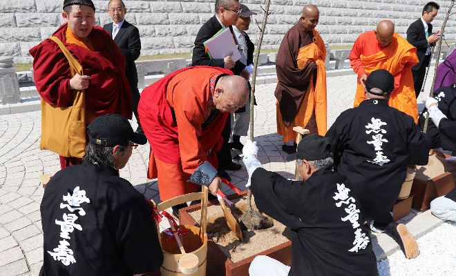 落慶を祝して 記念植樹 合掌される ノロドム・シハモニ国王陛下