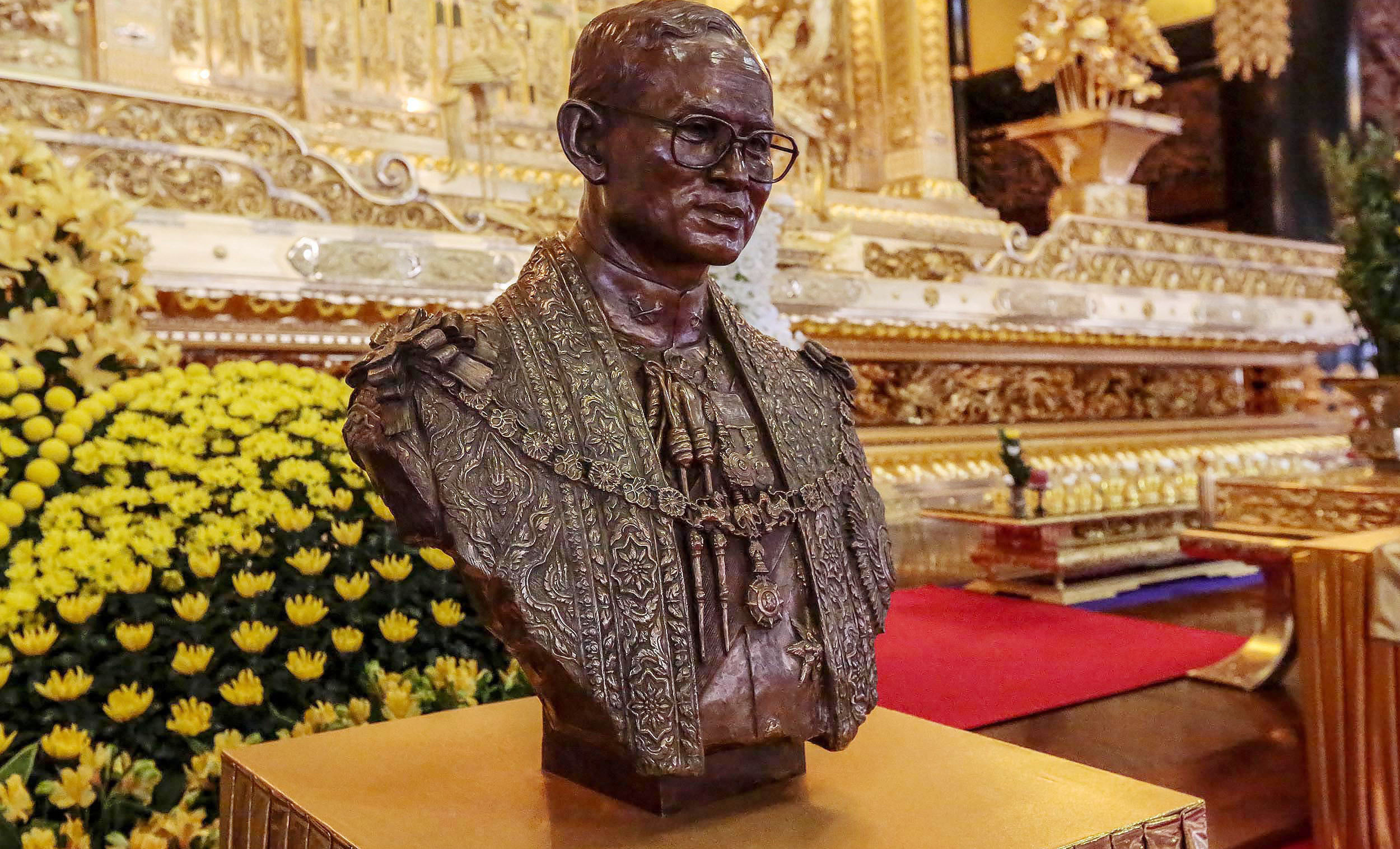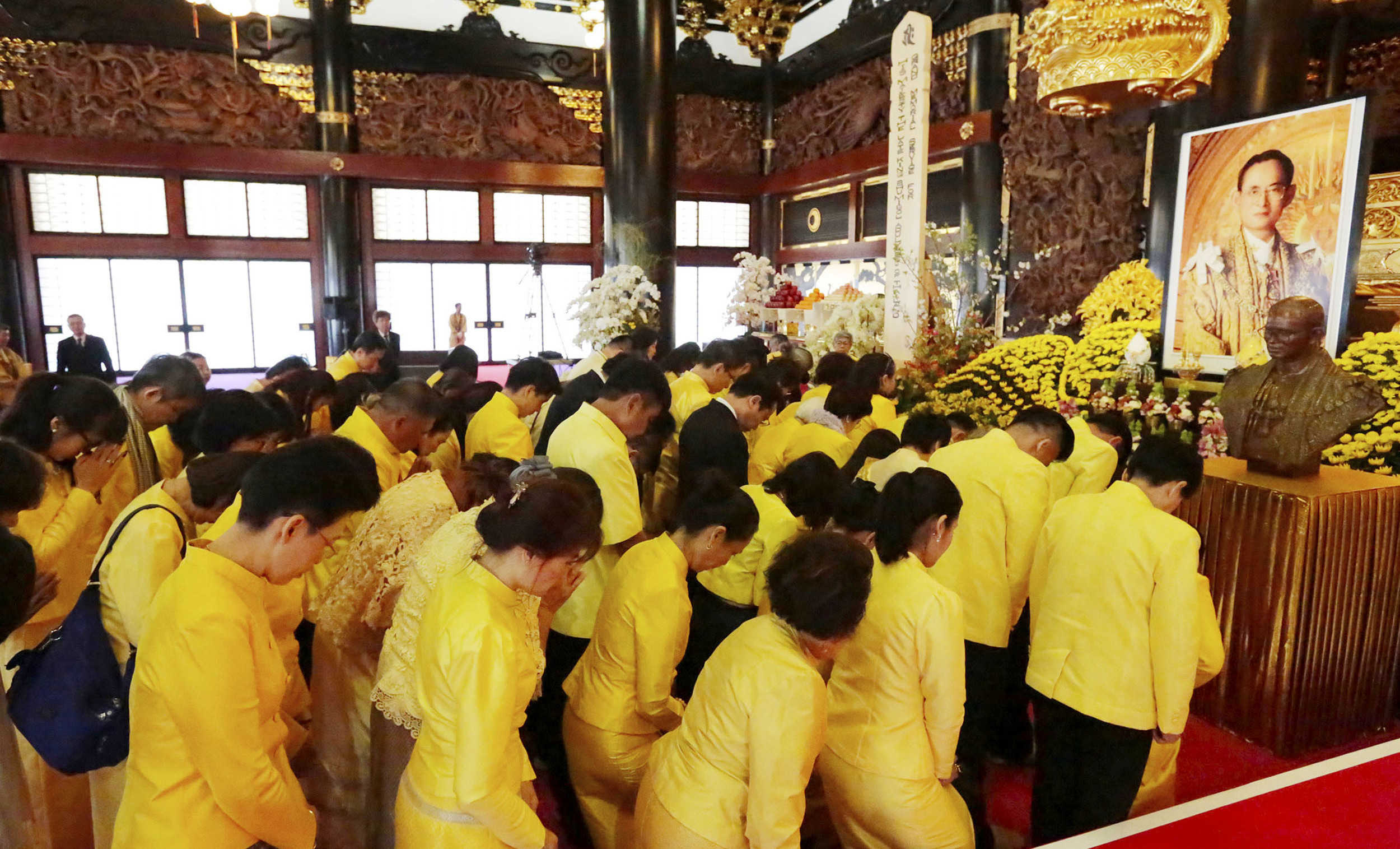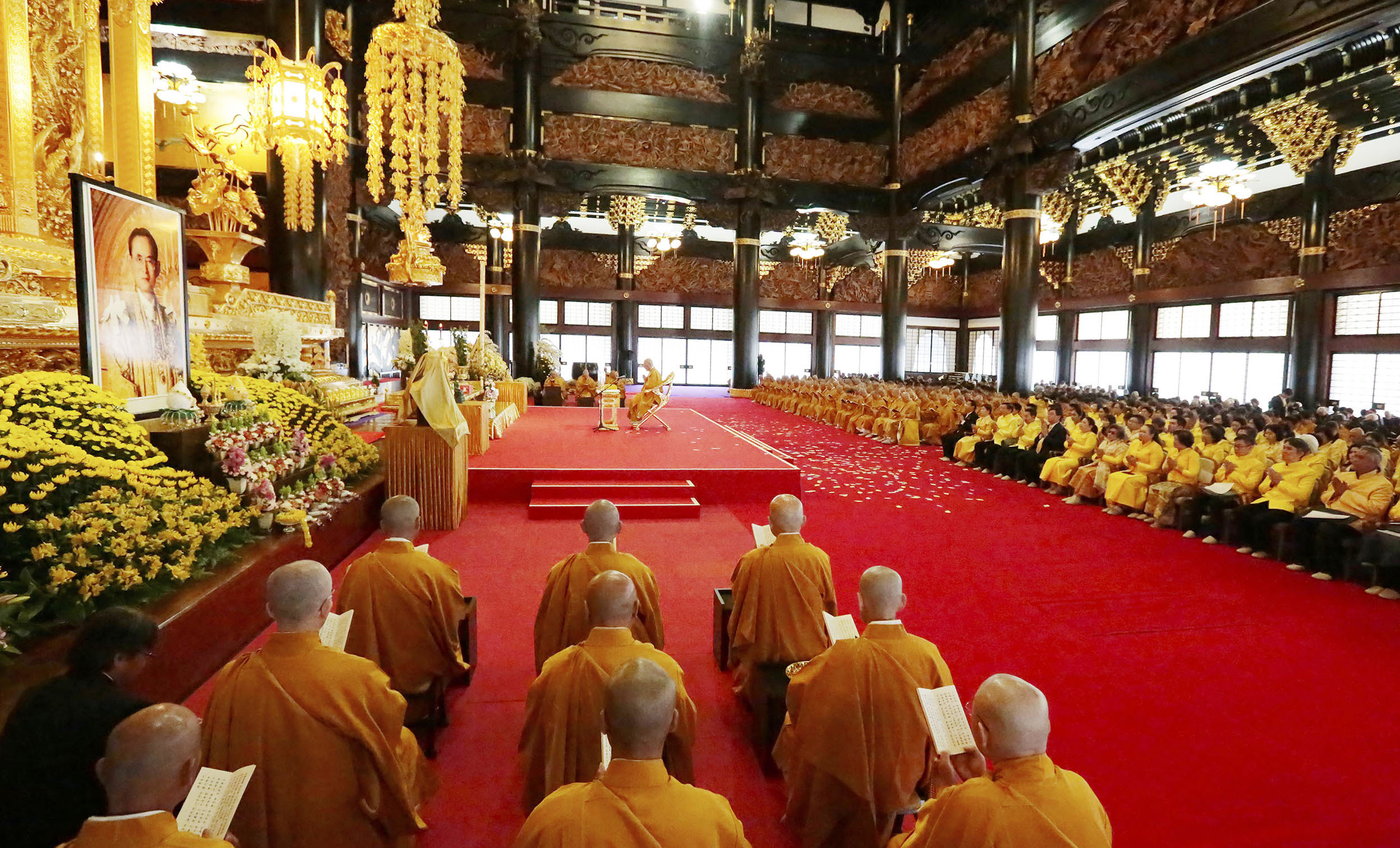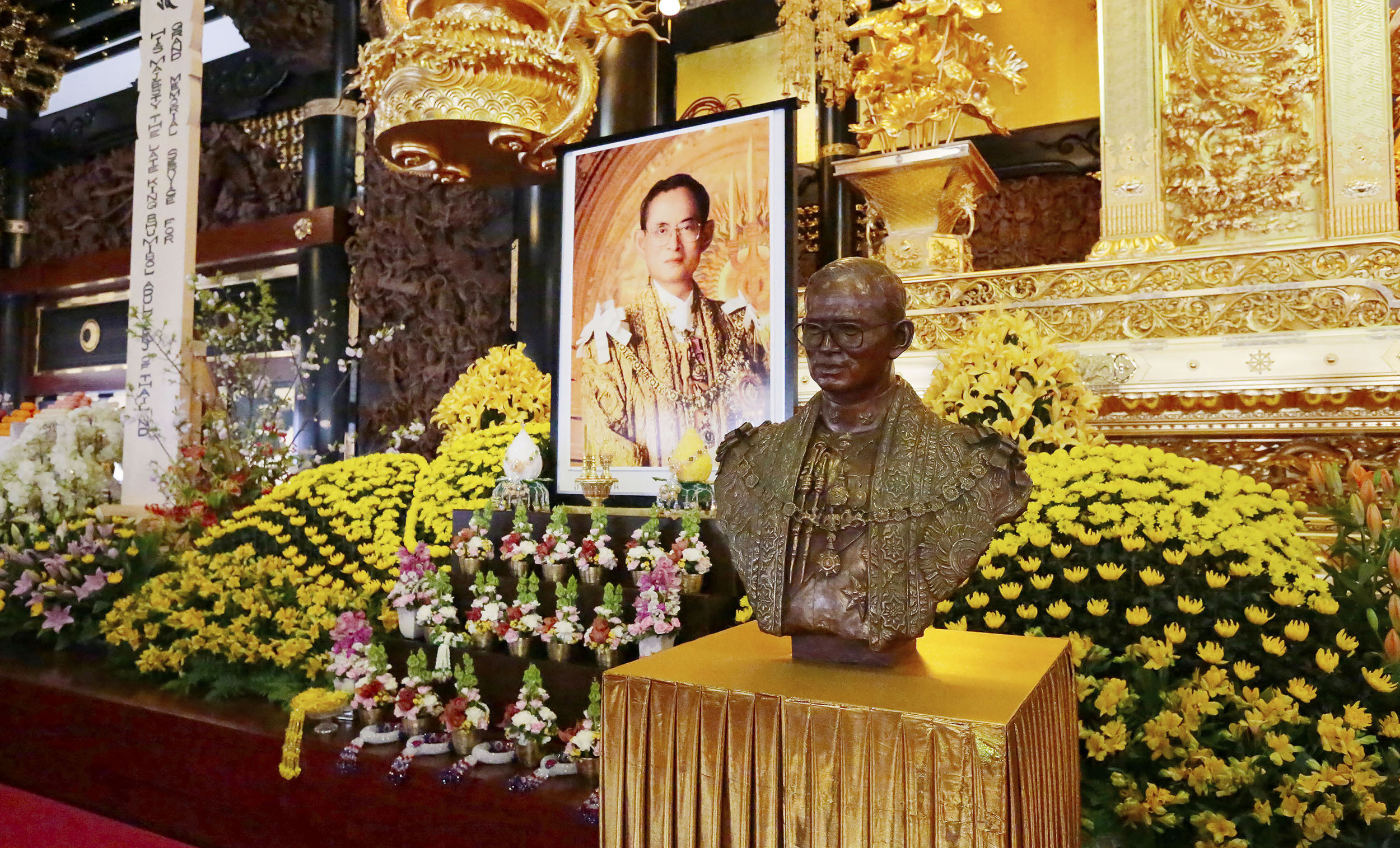 「佛教之王堂」本堂 宮殿前に祀られた 故プミポン国王陛下の御影と彫像