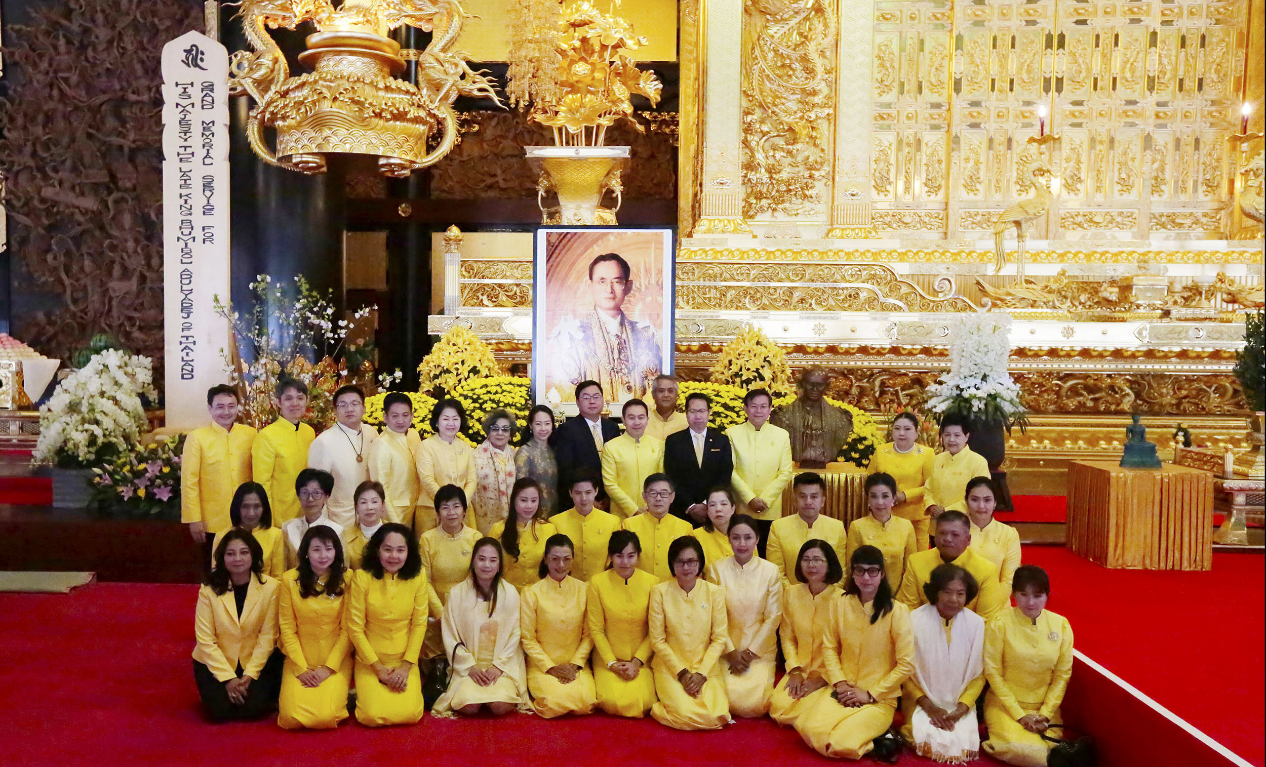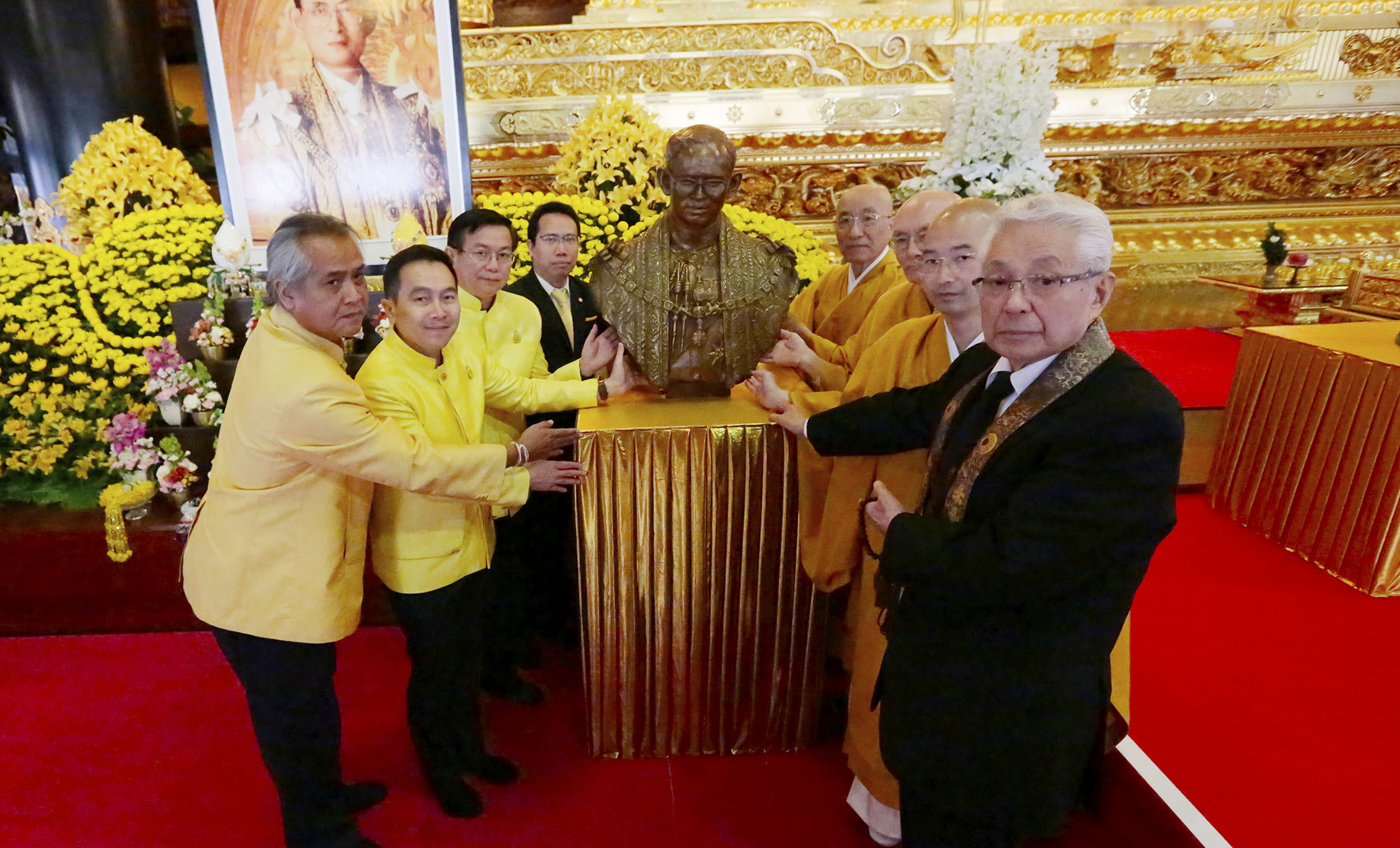 平成31 年4 月12 日、タイ王国のタムディ財団から、「故プミポン国王陛下の彫像を奉納したい」との申し出があり、財団会長 ダナイ博士率いる70 名ものメンバーが、遙々タイ王国から、故プミポン国王陛下追悼大法要に参列し、法要の中で彫像を奉納されました。